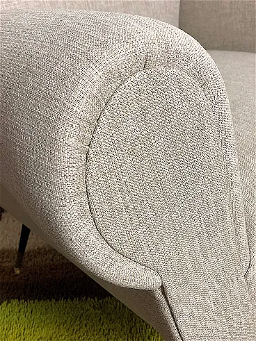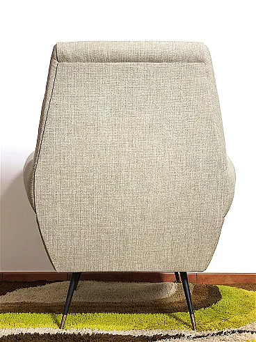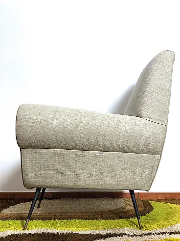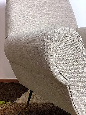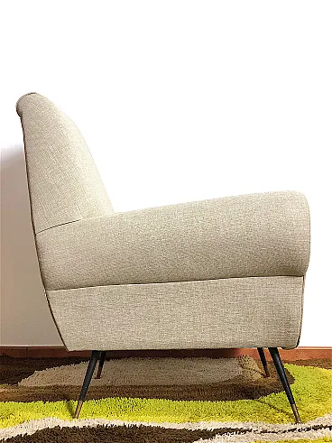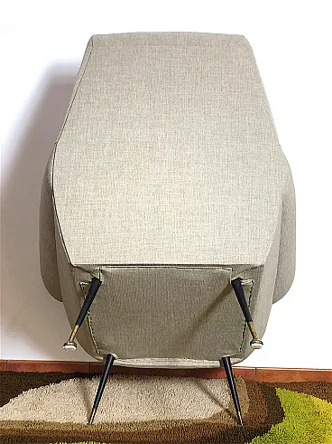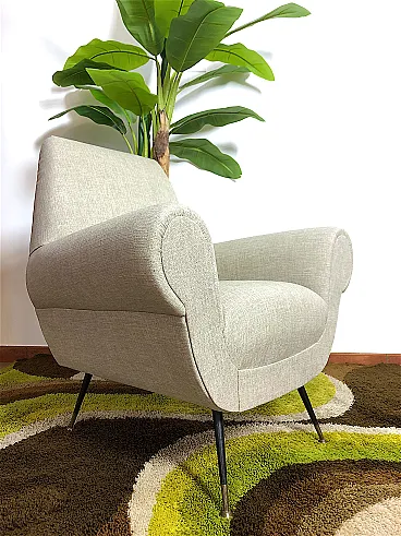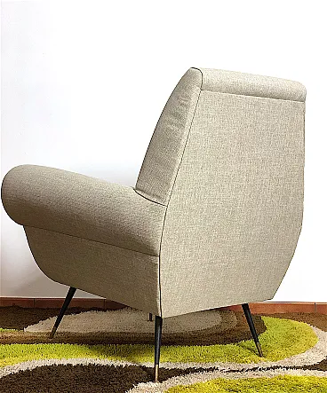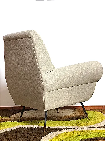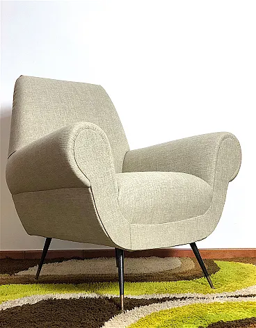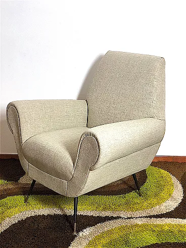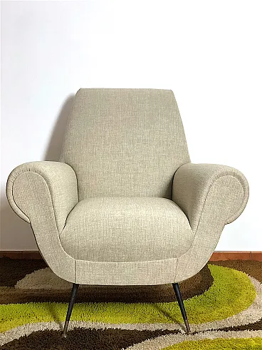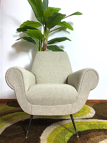 Extraordinary armchair of the 50s of the designer Gigi Radice, icon of the Mid-Century design. This piece perfectly embodies the elegant and sophisticated aesthetic of the time, with a harmonious design and refined details. Characterized by a slender structure, the armchair rests on tapered brass and metal legs, a distinctive element of the root creations, which give lightness and refinement, while the cured seams and the delicately toned profile attract attention to a high -level manufacture. Completely restored, new interiors and coating, the coating is in cotton of sand color (beige). Perfect conditions Measures: height 90 cm 9 90 cm cm 90 cm Cm 80-session 50 x 45 cm-45 cm seat