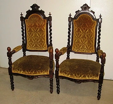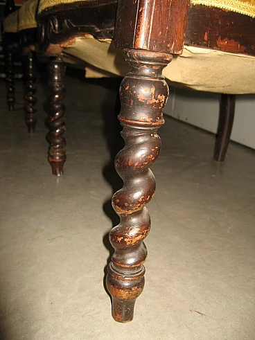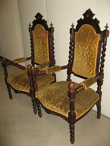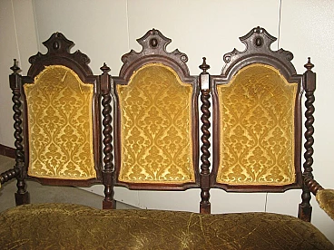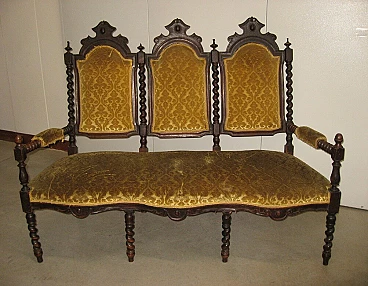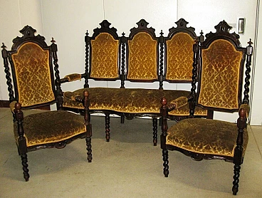 Living room in antique walnut "belle epoque". Sofa and two armchairs antique epoque end of 1800 beginning of 1900. Seventeenth-century style, model with torciglioni and carvings. The living room is in patina NOT RESTORED.
