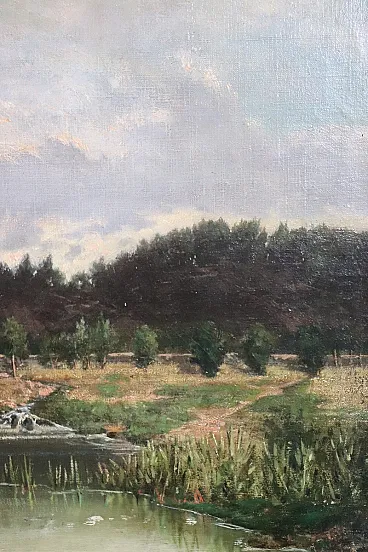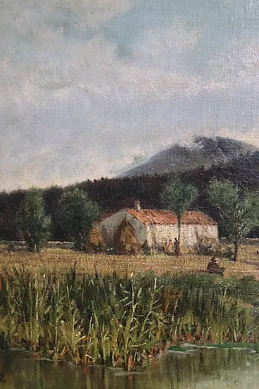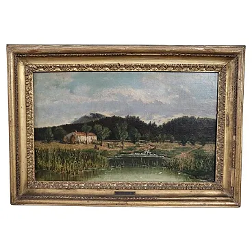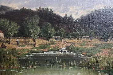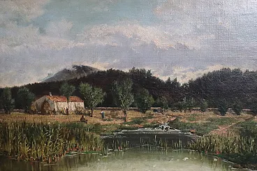 This painting magnificently captures the harmonious relationship between nature and human activity. The intense green of the vegetation evokes a sense of vitality, while the pond and impetuous stream add a dynamic element that gives life to the landscape. The inclusion of the country house and the figures who work in the fields suggests a narrative, perhaps reflecting the link between people and the earth.