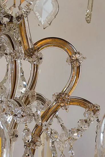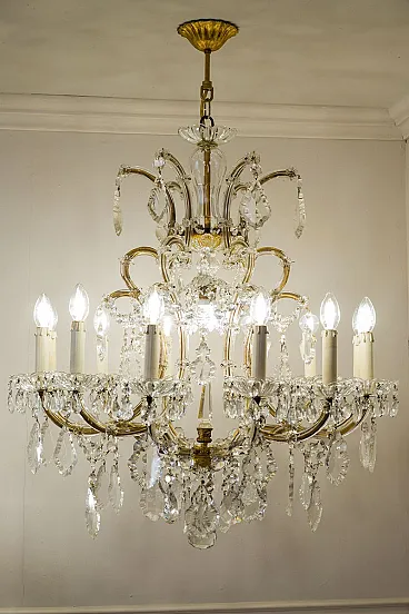 Elegant pair of vintage Maria Teresa chandeliers in cage-shaped Bohemian crystal, dating back to the 1930s-40s, illuminated by 12 external candles and a central internal light. The golden iron structure, covered with crystal sheets, is adorned with hanging crystal drops of various shapes, which refract the light with a scenographic effect. Chandelier height 90cm + chain