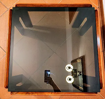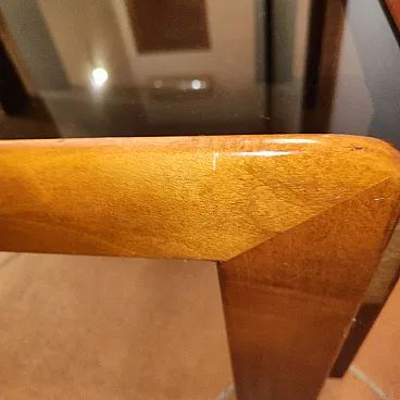 Coffee table from the 1960s, produced in Italy by Cassina and designed by Afra & Tobia Scarpa, represents an elegant example of Italian design, characterized by simple but sophisticated lines, in perfect harmony with the aesthetics of the time. Made of precious wood, the table has a solid and at the same time light structure. The smoke glass top, with essential geometric shapes, is finished with great attention to detail, while the wooden surface, well -kept and smooth, expresses warmth and refinement. The use of wood, natural and durable material, is exalted by the skill skills, who have been able to combine functionality and elegance in an object that at the same time becomes a piece of furniture and a declaration of style. The clean lines and the harmony of proportions are typical of the innovative vision of Afra and Tobia Scarpa, capable of combining the art of design with daily practicality. The article is in splendid conservative conditions, there is no important aesthetic or structural defect to report only very slight signs of the time due to use and age. MEASURES: Height 36 cm Width 63 cm Depth 63 cm Attribution brand: this piece has been attributed on the basis of archive documents, such as vintage catalogs, design records, or other literary sources. Preferable hand collection.