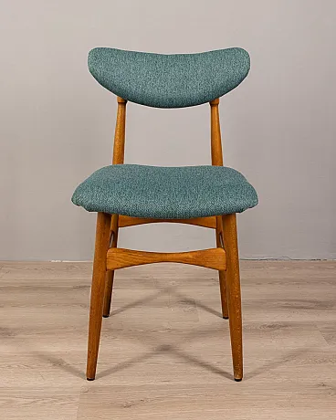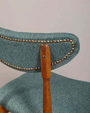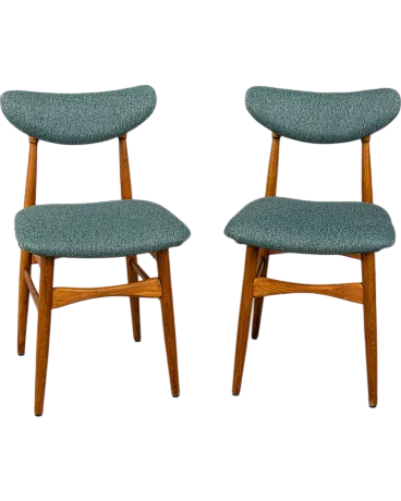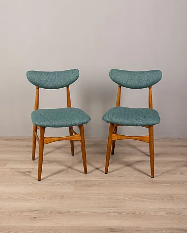 Pair of chairs with wooden structure with seat and back covered in green fabric, Italian design, 1960s.