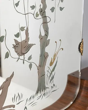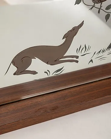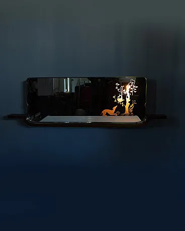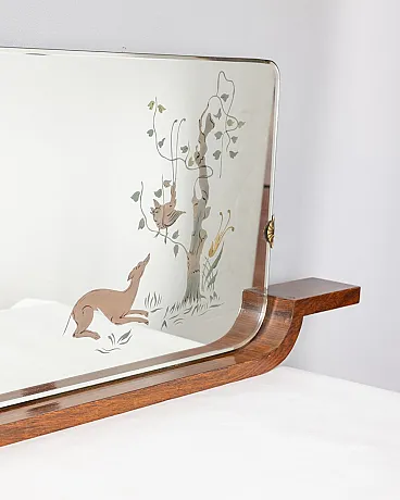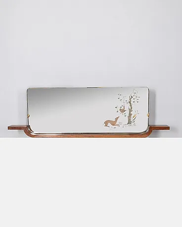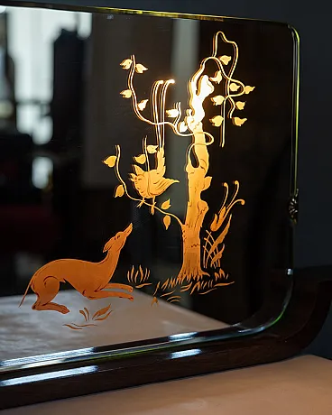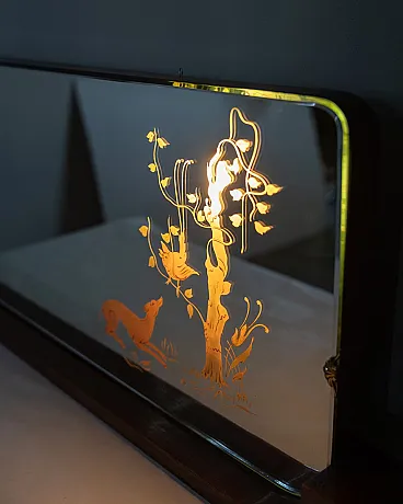Wall mirror with wooden structure, glass with backlit decorations, Italian design, 1940s.