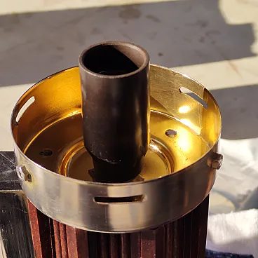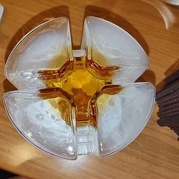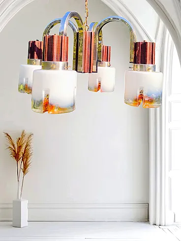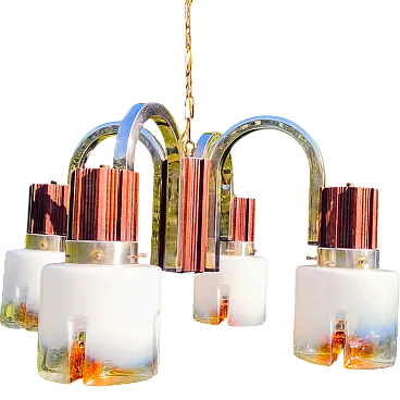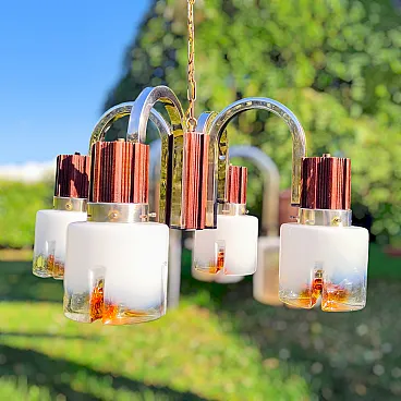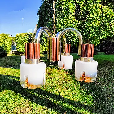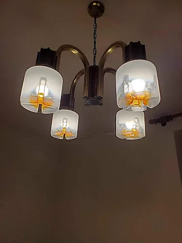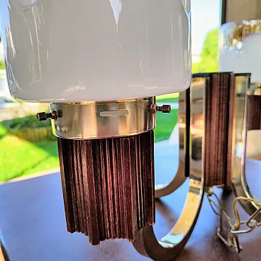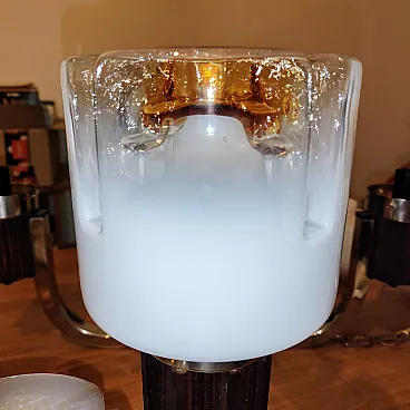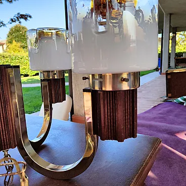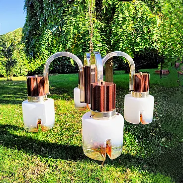 The Murano glass lampshade, pending, are suspended by four curved chromed arms with carved rosewood accessories from which the lampshades are suspended and kept in place with three chromed screws.