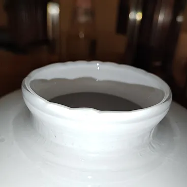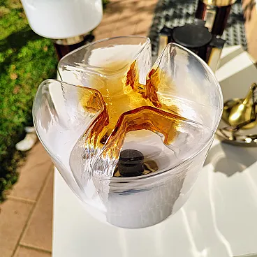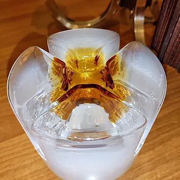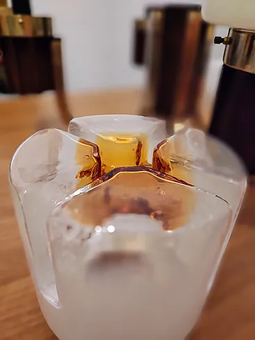 Each circular lampshade is opaque in the upper part and blends in transparent glass towards the base with an amber eye in the lower part.