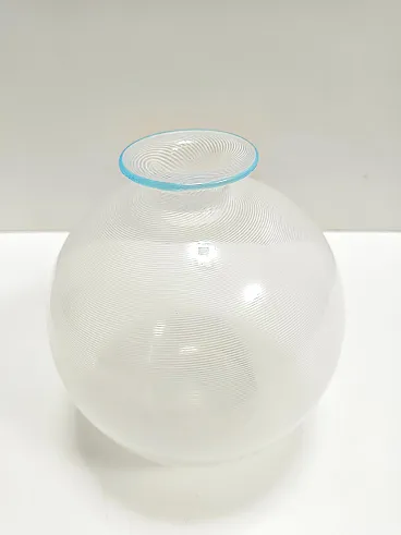 Made in Italy, 1970s. This is an extremely fine vase, designed by Ercole Barovier for Barovier & Toso's company in Murano. It is made in hand-blown glass with white canes. This is a vintage piece, therefore it might show slight traces of use, such as a really thin layer of limestone, but overall it can be considered as in excellent original condition and ready to become a piece in a home. It has its original label, even if faded. Diameter 15 cm Height: 20 cm Order it now! We sell the best quality pieces and we offer an amazing service: if it's not during night time, we answer within 2 hours and we absolutely love to follow every step of the purchase and even after. As matter of fact we really appreciate our customers’ feedback and when we receive pictures of our pieces in their new homes. We assist you during the process and answer all your questions. In addition to this, we always review the pieces before shipping, so that you receive the goods at its very best. We provide the best possible quotes and professionally and carefully pack the items. Insurance is included. And if there is any issue, it is our mission to make so you don't have to worry: we will always be there for you to assist in any way possible.