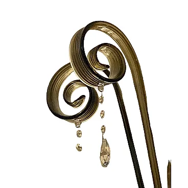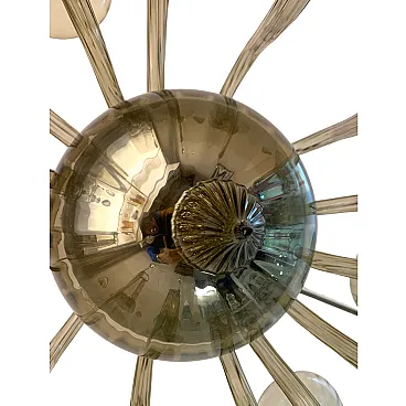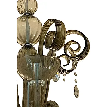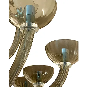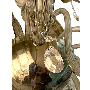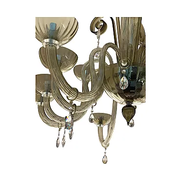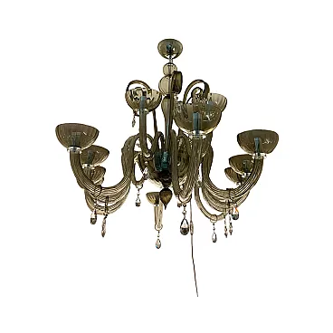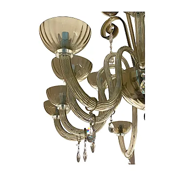 Champagne -colored blown glass chandelier with 12 light points. The chandelier is made up 12 arms of three different lengths arranged alternately in order to create harmony and movement SL Chandelier. The longest arms are more external and shorter in the innermost part. Each arm is decorated with a glass pendant at whose top there is a Swarovski crystal. In the innermost part then we find pastorals also decorated with Swarovski glass pendants and crystal. The chandelier is equipped with a double cup.