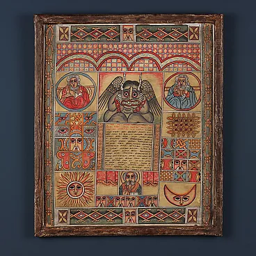 Prima Metà del XX Secolo Già Collezione Massimo Bargna Descrizione: Icona in legno incorniciata con al centro la rappresentazione di un diavolo alato in catene. Potrebbe trattarsi di Lucifero, l’angelo ribelle caduto dal Cielo diventato principe di tutti i demoni e poi sconfitto dall’Arcangelo Michele e dagli altri angeli (una raffigurazione in tutto simile è presente all’interno dell’antico monastero di Kebran Gabriel, sul Lago Tana). Al di sotto, un testo sacro con i versi più importanti tracciati in rosso e gli altri in nero. Ai lati del diavolo due figure di santi o anacoreti che reggono un testo sacro e una croce taumaturgica. Nella parte inferiore della tavola, ai lati, due simboli apparentemente di origine pagana, il sole e la luna. La rappresentazione è arricchita in basso dalla figura di un altro monaco benedicente e, tutto intorno, da altri volti di santi e da decorazioni geometriche policrome il cui modello si è tramandato attraverso i secoli. Dimensioni: 66 x 56 x 3 cm