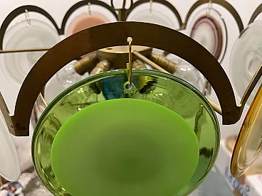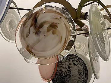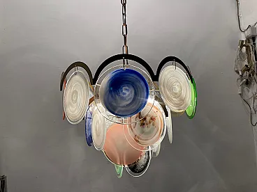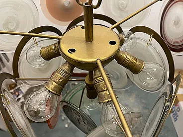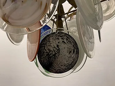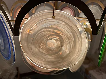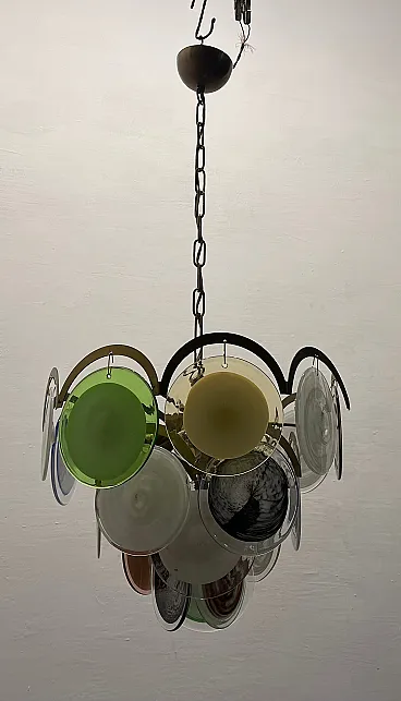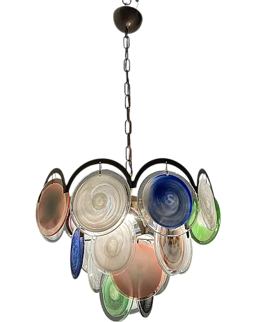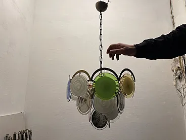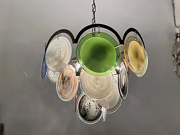 Item Name - Space Age Murano Glass Disc Chandelier, 1970s Price - € 990.00 per item Style - Mid -Century, Space Age Design period - 1970 to 1979 Production period - 1970 to 1979 Country of Manufacture - Italy Additional item Information - Murano Glass Disc Chandelier 1970's DULL GOLD Colord Frame Murano Glass Discs Each Disc varies in Color and Size As Each Are Handmade. Height Including Chain and ceiling Canopy 91 cm Height Without Chain 40 cm Width 46 cm features 7 lights requires e14 light bulbs new wiring instilled compatible with eu uk USA Materials - Murano Glass Color - green, red Weight Range = Light - Under 40kg Detaled Condition - Very good - This Vintage/Antique item has no Defects, but it May Show Slight Traces of Use. Restoration and Damage Details - Light Wear Consistent With Age and Use, Rewired and/Or New Electrical Components Type Plug - Not Applicable Is this Piece in Working Condition? Yes, I have Had to Professional Electrician Re-Wire The Piece. Additional Condition Information - New Wiring Height = 91 cm Width = 46 cm Depth = 46 cm