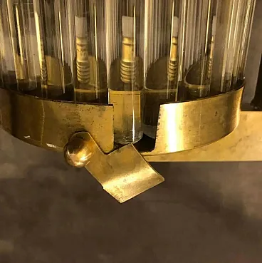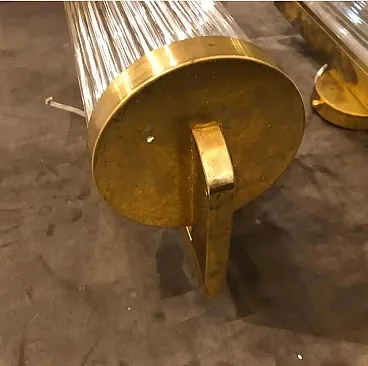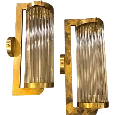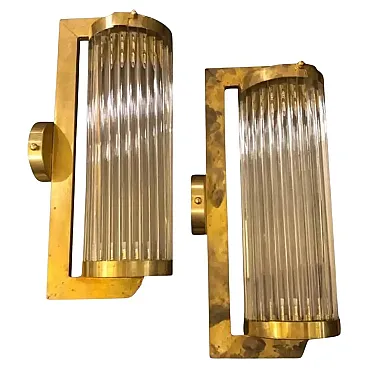 Two brass and glass wall sconces designed and manufactured in Italy in the late 20th century, electrical parts are fully restored, brass parts have been cleaned, the tube glasses can be removed to replace the bulb. The main material for the frame is brass, polished to a high shine, giving the sconces a luxurious and sophisticated appearance. The overall structure is sleek and clean, in line with the minimalist aesthetic of the era. The glass cylinders diffuse the light emitted from the bulbs, creating a soft and warm ambient glow. These sconces designed in the 1980s have a design that still feels relevant and elegant in contemporary settings. They have been used in many theaters or cinemas all over in Italy.