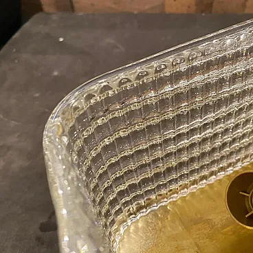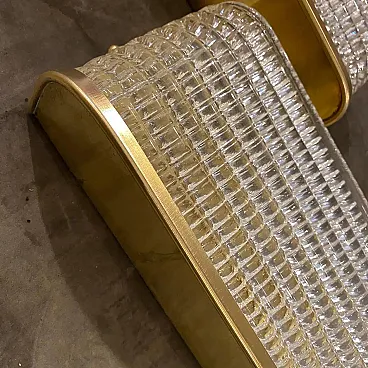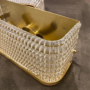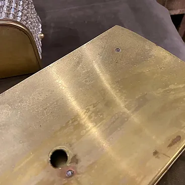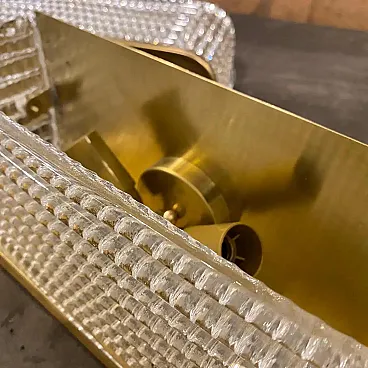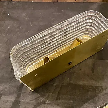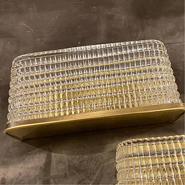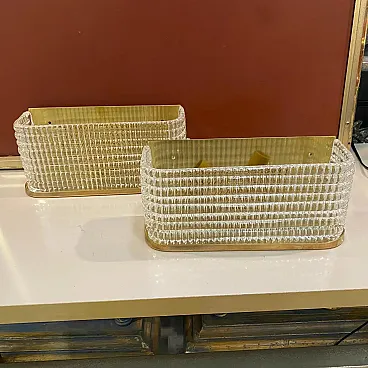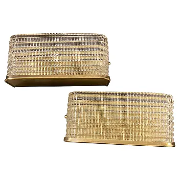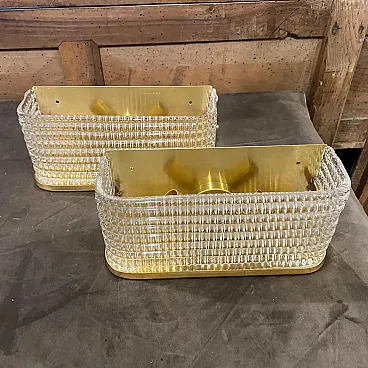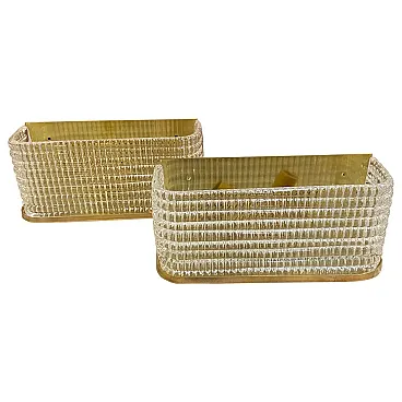 These two 1990s Mid-Century Modern Italian wall sconces feature a sleek rectangular design with a combination of brass and textured glass. The structured glass diffuses light softly while creating an elegant and sophisticated glow. The brass frames add a touch of warmth and luxury, making them ideal for a vintage or contemporary setting. Their symmetrical and refined aesthetic embodies classic Italian craftsmanship with a modernist approach, making them a perfect statement lighting piece. They have been inspired by similar wall fixtures of Max Ingrand. These wall sconces have been designed and manufactured in Italy in the Nineties, electrical parts are fully restored and brass it has been cleaned. They work with both 110 and 220 Volt and need two regular e14 bulbs.