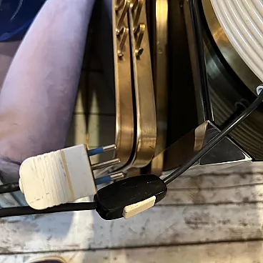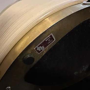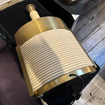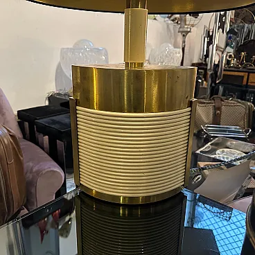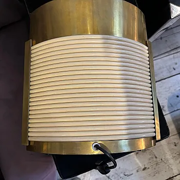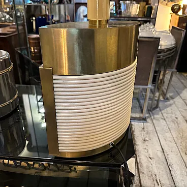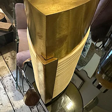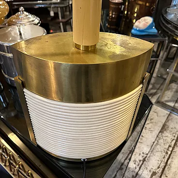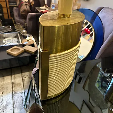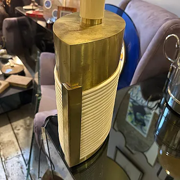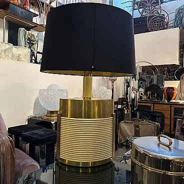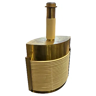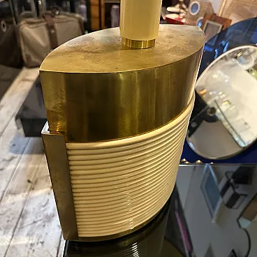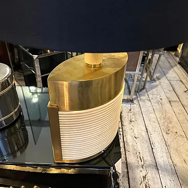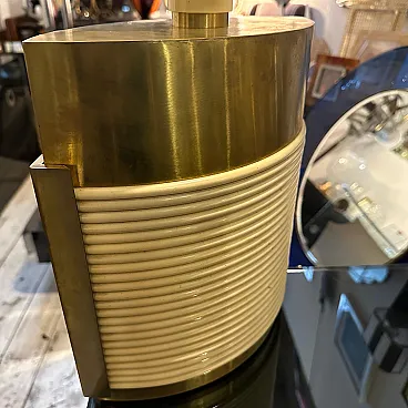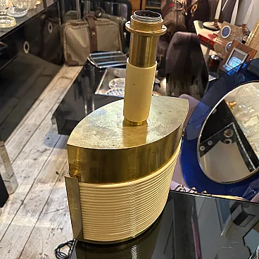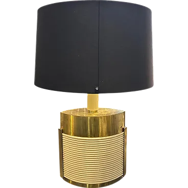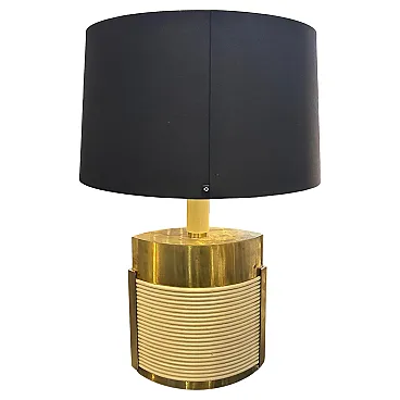 This is a 1970s Mid-Century Modern solid brass table lamp designed by Tommaso Barbi. It features a striking combination of brass and cream-colored resin, embodying the luxurious and sculptural aesthetic of Barbi's designs. The lamp has an eye-catching ellipse shape, with a smooth brass top and sides contrasted by a ribbed, coiled cream-colored accent on the front. The vertical brass and ivory-toned column extending upward serves as the lamp’s socket area. The combination of warm brass tones and ivory-colored detailing creates a luxurious, sculptural effect. The lamp’s sculptural presence makes it a statement piece, ideal for collectors of vintage Italian design. Barbi was known for his decorative, organic, and often nature-inspired lighting and furniture designs, and this piece reflects his mastery of materials and form. The lamp’s sculptural presence makes it a statement piece, ideal for collectors of vintage Italian design, Mid-Century Modern décor, and luxury lighting. Its bold yet refined aesthetic makes it a perfect addition to both contemporary and retro interiors. Dimensions are without lampshade not included, brass is in original patina, resin is in good condition with normal signs of age. The lamp is labeled on the bottom with original Tommaso Barbi sticker.