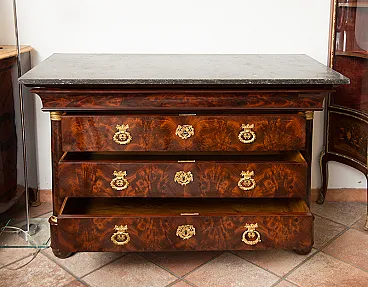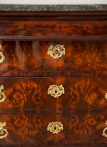 The front is marked by three large drawers adorned with beautiful finely chiseled golden bronze vents with a floral motif.