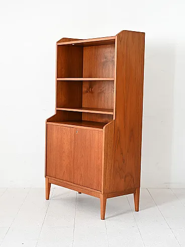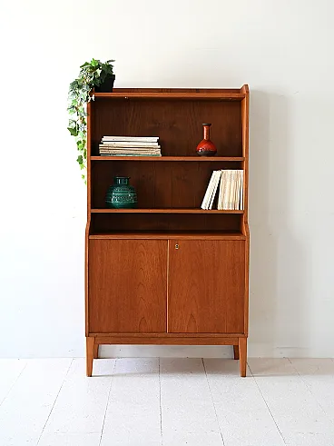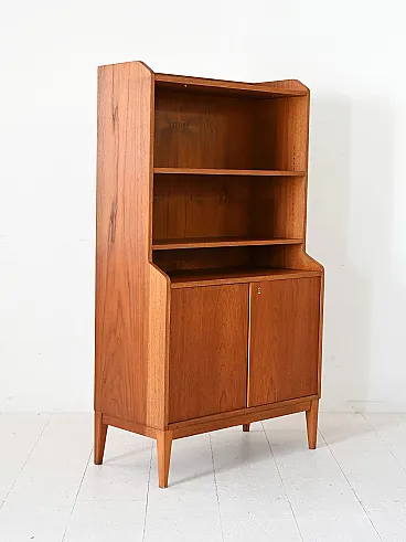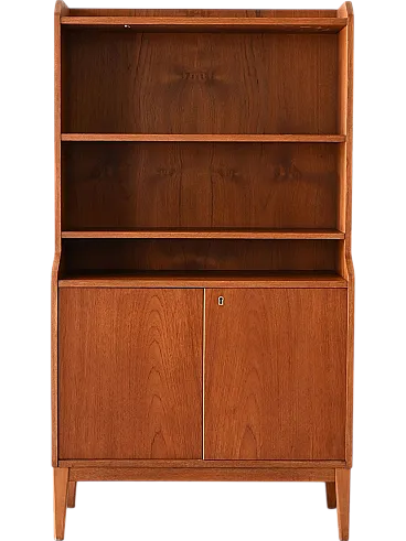 Elegant 1950s library in Teak, with three open shelves and compartment closed by doors to doors. Scandinavian Vintage Teak bookcase, made in the late 1950s. The structure has three shelves in the upper part and a compartment closed by two doors to the doors, with an internal shelf. The essential lines and the typical design of the time make it suitable for different contexts. Good condition. It may present signs of time. Pleasure pay attention to the photographs.