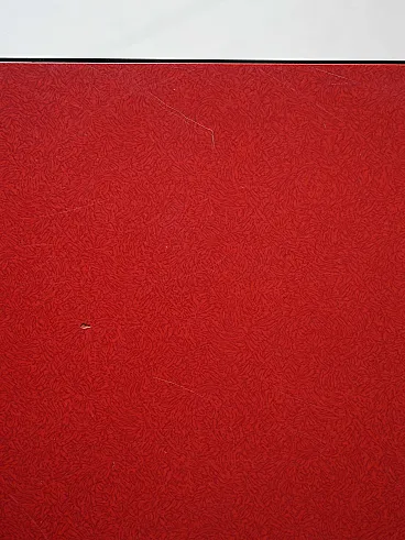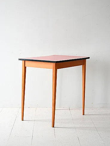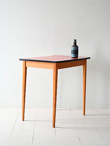 Vintage Scandinavian table of the 60s characterized by a slender structure with tapered legs in solid wood. The plane is covered in red ant, typical material of the time, with a black edge that defines its profile. An essential and functional design, in perfect Nordic style, which combines practicality and visual lightness.