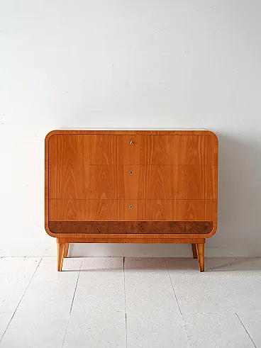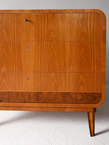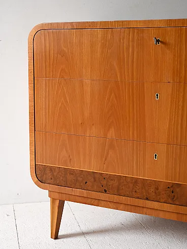 Swedish drawer from the 1940s in Olmo's veneer, with three drawers equipped with lock. The design is characterized by rounded corners and a lower range in root, which creates an elegant visual contrast. The tapered legs give lightness to the structure, while the veins of the wood add depths to the surface. A piece that reflects the functional and refined aesthetic of the Scandinavian design of the time. It may present signs of time. Pleasure pay attention to the photographs.