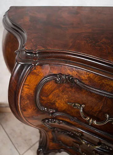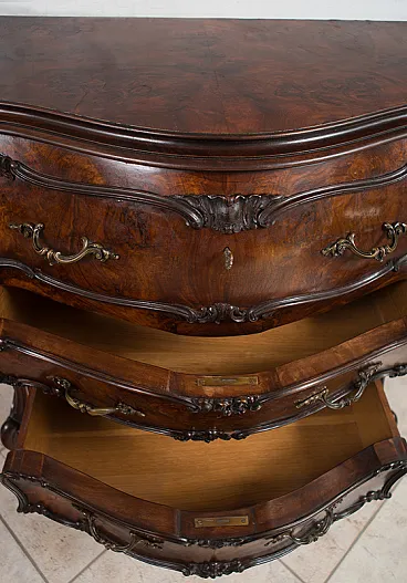 Description: Refined Liigi XV Venetian style drawer in walnut root with oak interiors dating back to the early twentieth century.