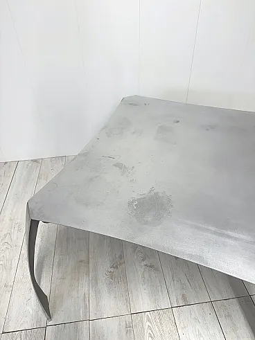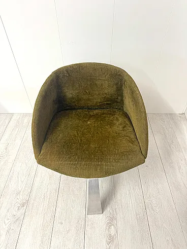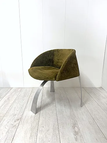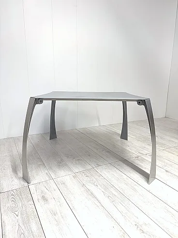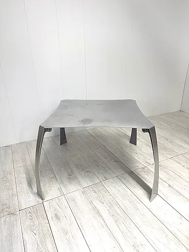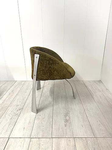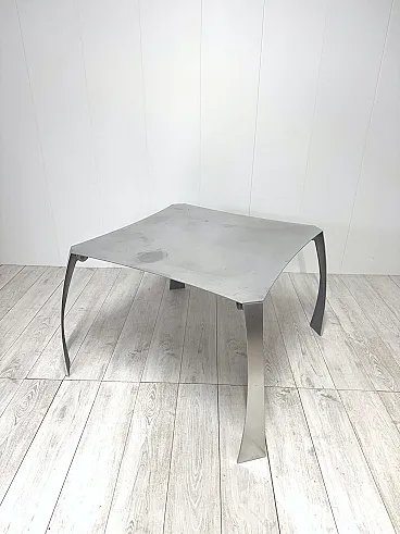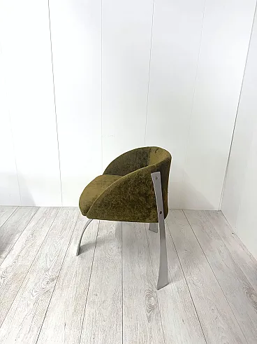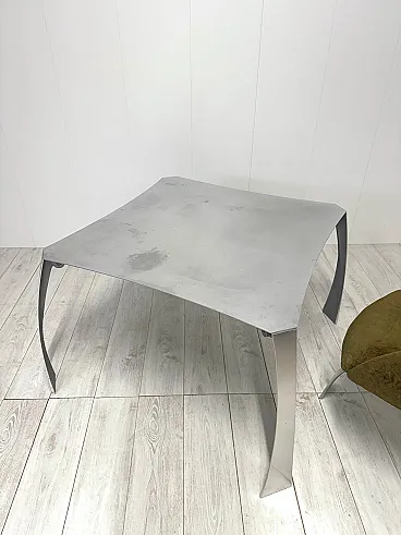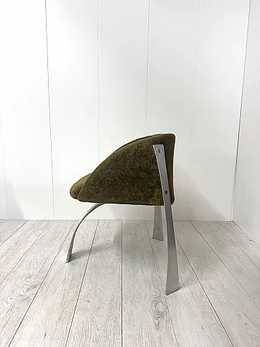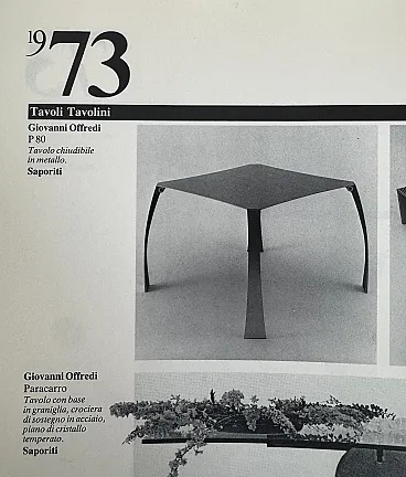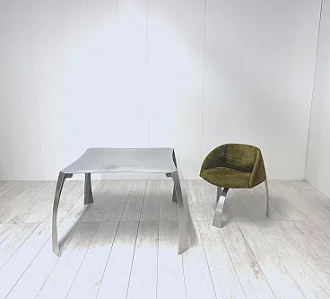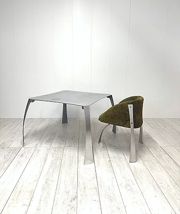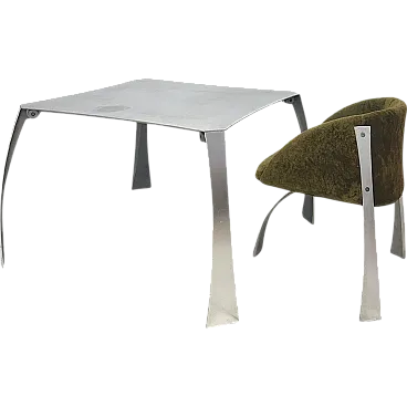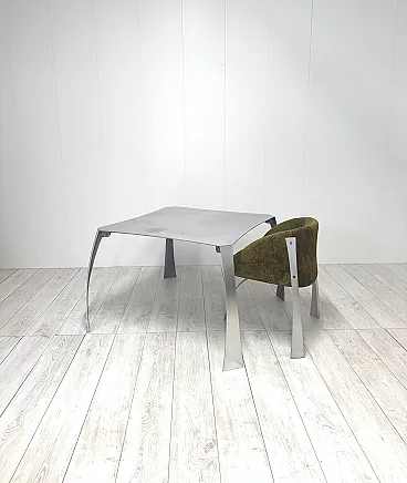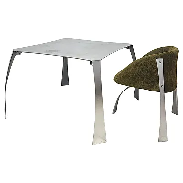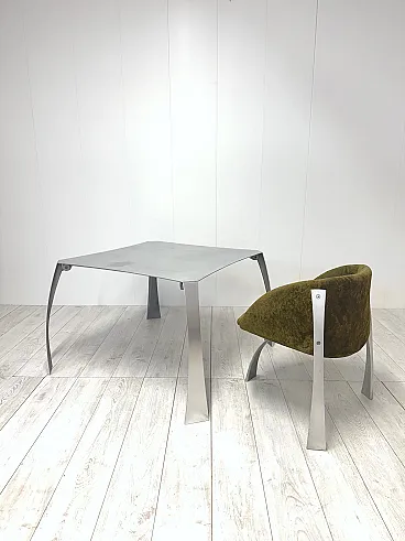 Rare table mod. P80 designed by Giovanni Offresi and produced by Saporiti since 1973. Metal folding table; small armchair with upholstered seat and back covered in original vintage velvet. Present some stains on the tabletop.