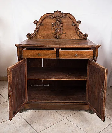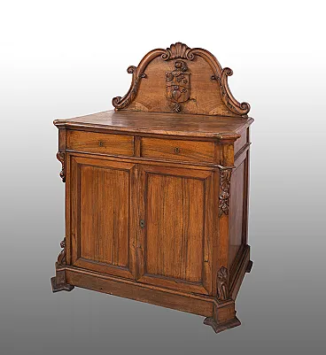 Description: Solid sideboard with a lift with a heraldic coat of arms of the family to which they belong.