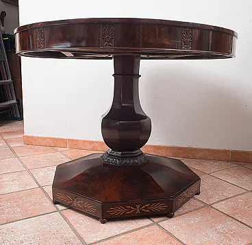 Tutto intorno al perimetro del tavolo vi è una riserva di intarsio a palmette e racemi tipici dello stile di appartenenza.