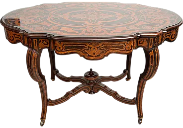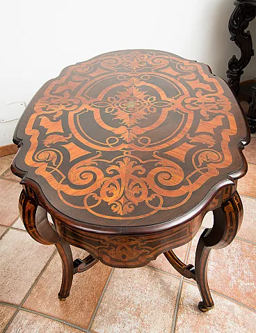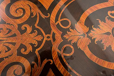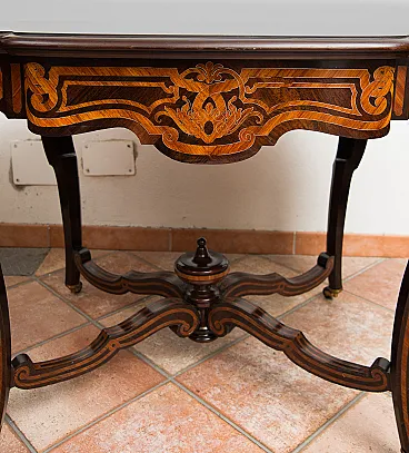 Description: Table/desk Napoleon III French in precious exotic wood belonging to the second half of the nineteenth century. The hinged -handing band contains two drawers that characterize the two longer sides. The plan has a dense inlay with a leafy motif surrounded by silver fillets and in the center a plate with the monogram of the family to which they belong. The four feet having a cabriolet shape are connected by a mystery cruise with a pinnacle in the center. Origin: France 19th century. Measures: 130x84 H75cm. Document: certificate of authenticity. Conditions: not restored, but in a very good state. Assistance: we are at your disposal for further clarifications or photographic details Shipping: throughout Italy Europe and the rest of the world at very low prices in maximum safety and traceable. The shipment will be agreed privately and will not be high cost. We wish you a good day. Borrelli Antiquity.