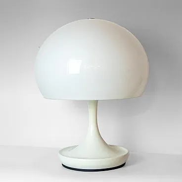 Mushroom -shaped table lamp, in the style of Louis Poulsen, Italy 70s Produced in Italy in the 70s, this desk lamp is an elegant example of the charm of the time for organic forms and minimalist design. His silhouette, reminiscent of a classic mushroom, brings a touch of retro charm, however expressed in a modern design approach. Made of plastic materials, this lamp has a smooth and rounded lampshade that spreads the light gently, creating a warm and inviting atmosphere. The clean lines and the ordered shape pay homage to the iconic design of Louis Poulsen, a Scandinavian lighting master. This lamp was meticulously revised and polished, ensuring that it is not only visually captivating but also in perfect operating conditions. His condition is considerably well preserved, with only a few slight signs of the time.