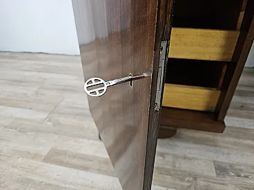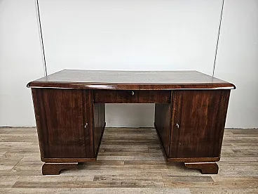 Elegant of the 1930s desk of the Art Decò with oak wood structure, enriched by two side doors and a central drawer. On the left we find three large and robust drawers, on the right side two internal shelves. In the center there is a drawer. All locks are functional and accompanied by original keys of the time. Polidable shellac furniture, presents normal wear signs due by age and use.