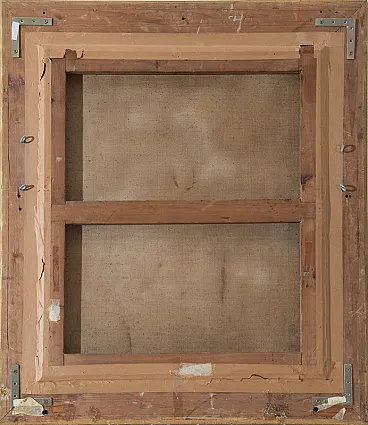 Description: Ancient painting oil on canvas depicting Madonna and Child with golden and carved wooden frame.
