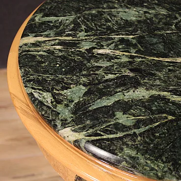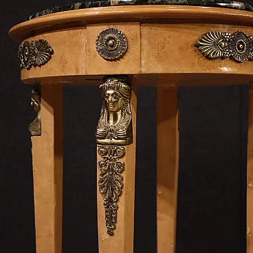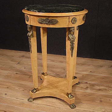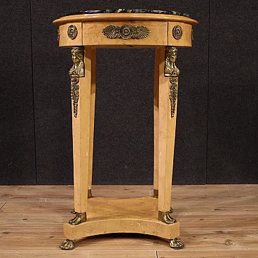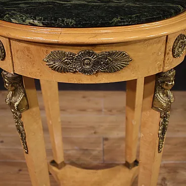 French table of the second half of the twentieth century. Retour's Retour style cabinet with tuia root venerated, with beech elements, richly adorned with golden and chiseled metal decorations. Upper floor in marble of good extent and service, ideal for displaying marble sculptures, bronze or vases with flowers. Table of excellent proportion, good usefulness and pleasant furniture. Mobile placed on zoomorphic feet, the base connects to the floor via four columns with cariatid figures (see photos) typical of the French style. It has some small sign of the time, structurally healthy and solid, overall in good condition.