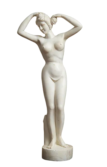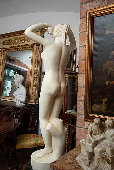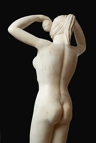 Description: Statuary white marble sculpture depicting a young woman who shows herself in a pose deriving from ancient classicism, to touch her hair and keep a flower that has in her hair.