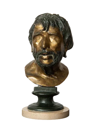 Description: ancient burnished bronze sculpture depicting the head of the philosopher Seneca. The head of the Greek philosopher Seneca also called Pseudo-Senca as it was discovered in Herculaneum in 1754 and found in the National Archaeological Museum of Naples. The original placed in the 1st century BC It is the basis of inspiration for numerous sculptors and artists who reproduce their features in bronze mergers. Origin: Naples 20th century. Measures: diameter 20cm. Height 48cm. Document: certificate of authenticity Assistance: we are at your disposal for further clarifications or photographic details Shipping: throughout Italy Europe and the rest of the world at very low prices in maximum safety and traceable. The shipment will be agreed privately and will not be high cost