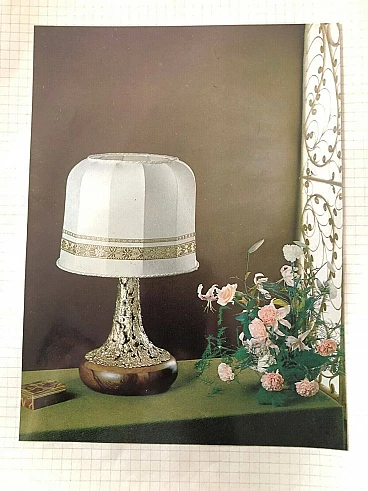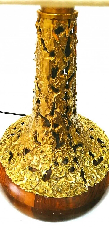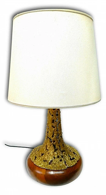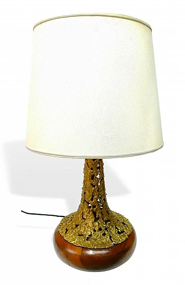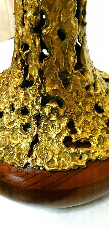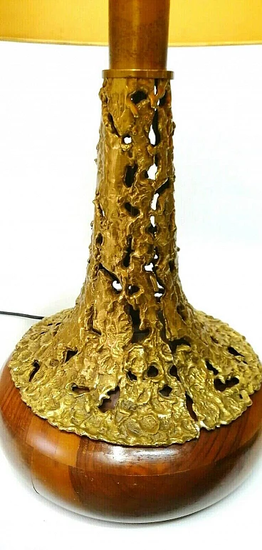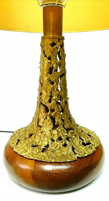 Table lamp original production of Esperia, design Angelo Brotto, year of realization 1977, very few examples in the world, the only one on sale. Realized with a wooden base and a vertical structure in perforated bronze casting, of rare elegance and value. It measures altogether 75 centimeters in height, 30 centimeters in diameter the wooden base, 45 centimeters the only part of the lamp without hat. Very good storage conditions, slight and obvious signs of age and use on the wood, perfectly working. I can attach e-mails of Esperia Illuminazione with certification of authenticity, published, among others, the photo of the official catalog of the time. Also available the original hat as in the photo from catalogue.