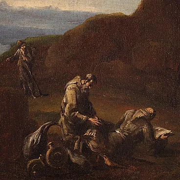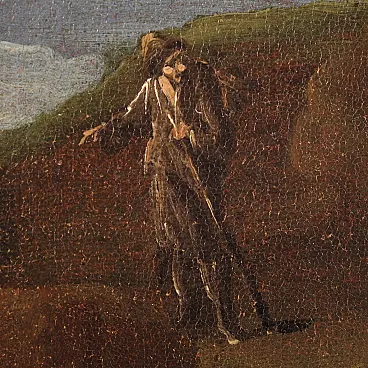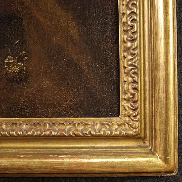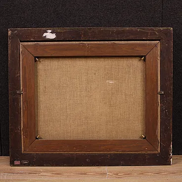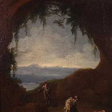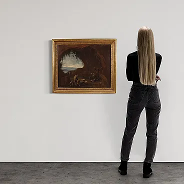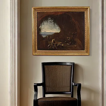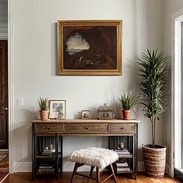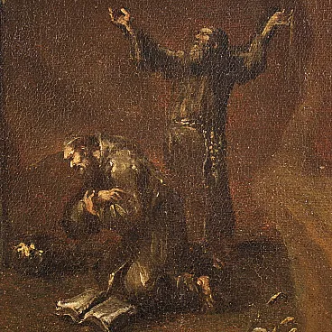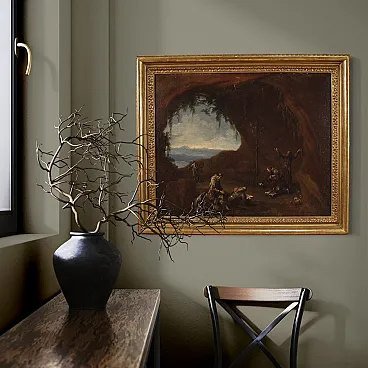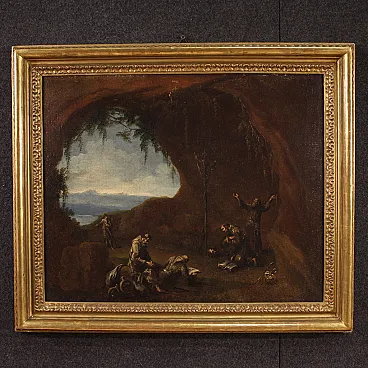 Gorgeous Italian painting of the first half of the eighteenth century. Oil work on canvas depicting a scene of hermit life of Franciscan friars in attitudes of profound prayer. The mystical atmosphere transports us into a cave, a place of penance and ascetic practice. The picture recalls the Genoese school and the area of Alessandro Magnasco (1667-1749), famous for its representations of monastic scenes with distorted figures and with a rapid and nervous pictorial trait (the work is currently not accompanied by expertise, but it is possible to obtain it upon payment of the related additional costs). Cake of the 20th century in carved and golden wood, of beautiful decoration, with some signs of the time. Work already restored with Rintelo, replacement of the frame and color recovery in small points. Overall in good conservative state. Painted light h 57 x l 70 cm.