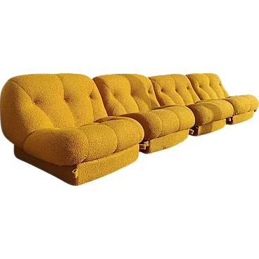 Set of 4 "Nuvolone" armchairs by Rino Maturi for Mimo Leone & Co., Italy, 1970s This splendid set of four "cloud" modular armchairs, designed by Rino Maturi for Mimo Leone & Co. in the 70s, embodied the best of the Italian design Space Age and Mid-Century Modern. Equipped with a boulé mustard bouclé tissue, these chairs offer exceptional comfort and bold aesthetic. The original plastic base maintains its authentic vintage charm, with small signs of wear due to time. This versatile system of sessions can be arranged as a single armchairs or combined without continuity to create a low four -seater sofa, which makes it a perfect choice for modern, eclectic and retro interiors. Dimensions: Height: 70 cm (27.56 inches) Width: 95 cm (37.41 inches) Depth: 95 cm (37.41 inches) Sit height: 35 cm (13.78 inches) In excellent condition, with restored and light wear clash on the basis consistent with its age. An iconic and rare set, ideal for collectors and design enthusiasts.
