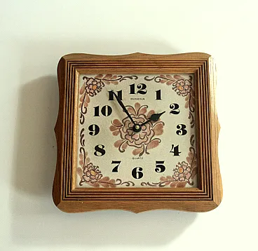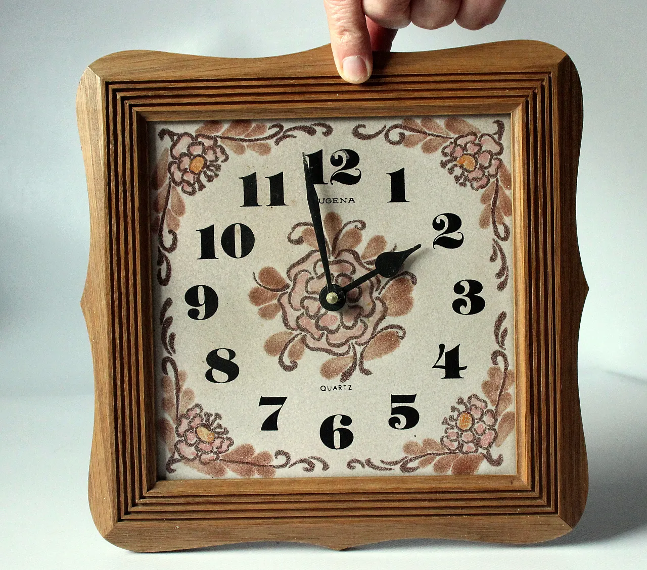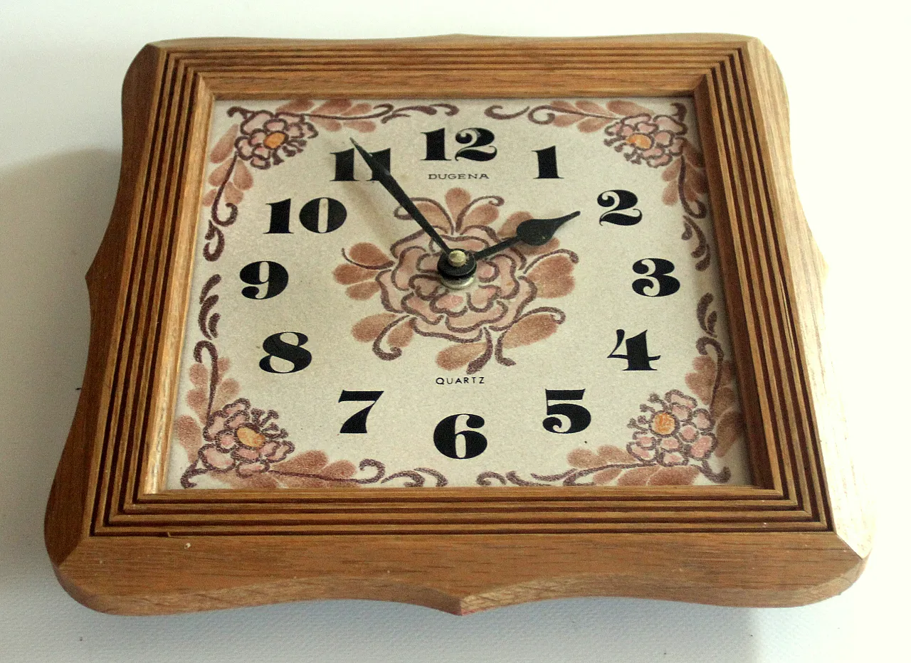 Dugena wall clock - kitchen clock from the 80s - works with battery - made of wood (frame), ceramic and a metal back side, complete working - in excellent vintage condition with minimal traces of age and use dimensions 27 x 27 x 5 cm - weight 1,58 kg !!
