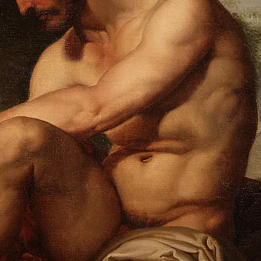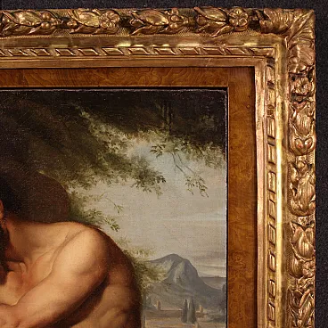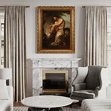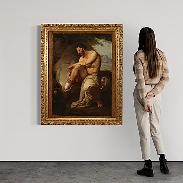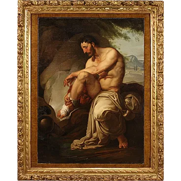 Great neoclassical Italian painting of the first half of the nineteenth century. Oil work on canvas depicting a mythological subject with a great charm, wounded threads. Famous Greek archer, he owned the arrows and the arch of Heracles, donated to him by Heracles himself who wanted to thank him for having set the fire to his pira. In the expedition against Troia Filottete, he led a contingent of seven ships, but never came to his destination, because during a stopover on the island of Lemno, he was bitten by a poisonous snake in the foot. The work of considerable pictorial quality attributable to a contemporary follower of Francesco Hayez, as the picture is inspired by the prototype of the great master painted in 1820 and today exhibited at the Museum of Modern Art in Bologna. Beautiful coeval frame in finely carved and golden wood, with small passepartout, of great decoration. Work already restored with Rintelo, replacement of the frame and color recovery in small points. Overall in good conservative state, with some signs of time. Painted light H 108.5 x L 79 cm.