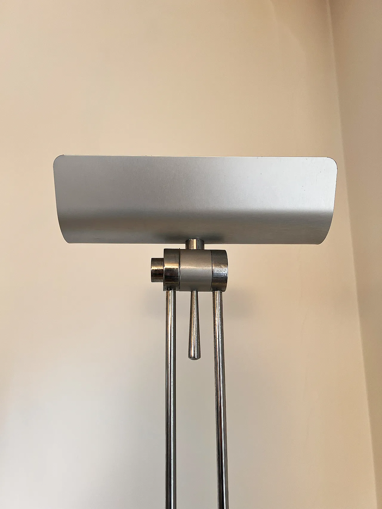 Pair of Vintage Design Targetti lamps, rare model. The lamp is of Italian manufacture, with original electrical system and adjustment of light intensity. The structure is made of cherry wood, with chromed metal details and an adjustable speaker. Equipped with R7S Max 300W attack, pedal switch and stable base.