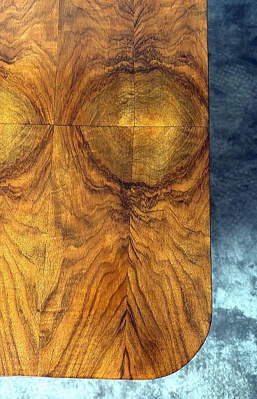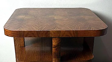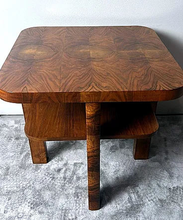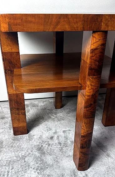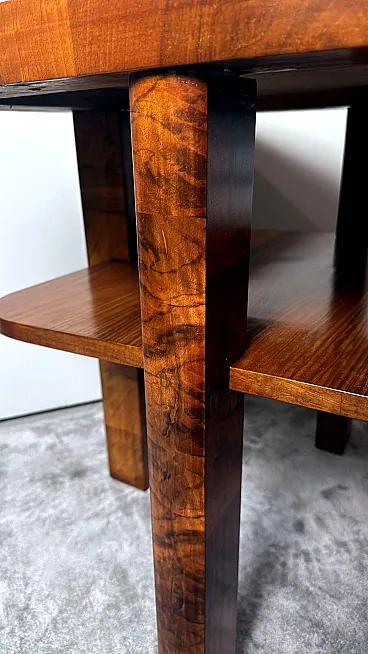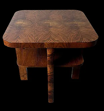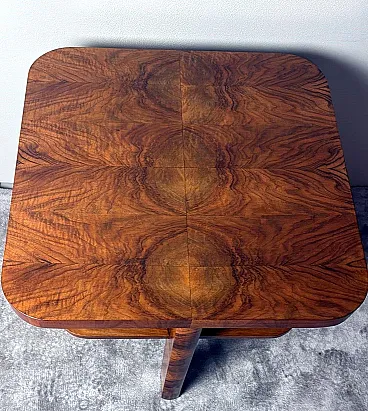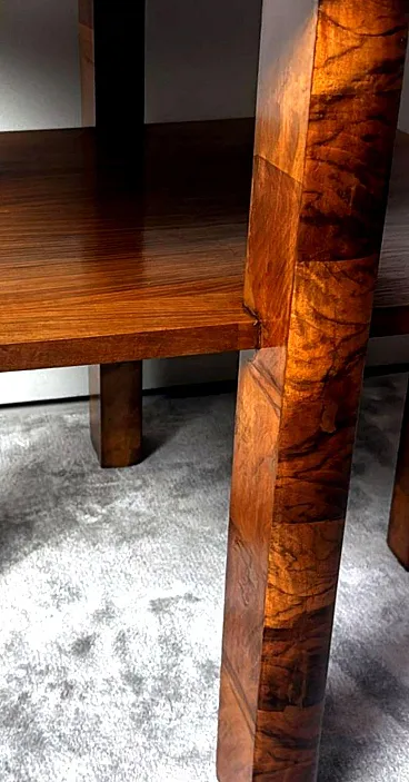 This elegant and refined French Art Deco square table is crafted from walnut burl. The entire structure is made of solid walnut, beautifully adorned with a decorative veneer of precious walnut burl. The square tabletop is supported by four sturdy legs with a distinctive rectangular cross-section. A second lower shelf is positioned just beneath the main surface, creating an open space between the two levels. This design not only enhances the table’s stability but also contributes to its harmonious and well-balanced aesthetic, making it both unique and functional. The artisans aimed to create a compact yet sophisticated piece with clean, decisive lines. The result is a timelessly elegant table, whose design balances austerity and precision with refined simplicity, giving it a dynamic and distinguished character. This table was handcrafted between 1930 and 1935 by a master artisan in a renowned woodworking atelier in Pont-de-Beauvoisin, a French town in the Isère department, famously known as the "City of Furniture" due to its long-standing woodworking tradition. The artisans employed traditional techniques of sanding, varnishing, and polishing to enhance the natural depth, flame patterns, and grain of the walnut burl. These methods give the tabletop a stunning and captivating appearance. Walnut burl is sourced from the tree's root system and is distinguished by its intricate, twisted grain patterns, which give it remarkable hardness and density. Beyond its durability, it is highly prized for its aesthetic appeal—each piece is unique due to the naturally varying grain patterns, making it an exceptionally elegant and refined material. Walnut burl is particularly associated with luxury furniture design. Art Deco refers to a style and aesthetic movement that flourished in Europe and the United States during the 1920s and 1930s. The term "Déco" originates from the "Exposition Internationale des Arts Décoratifs et Industriels Modernes," held in Paris in 1925, which marked the beginning of this artistic phenomenon. Art Deco influenced decorative arts, visual arts, architecture, and fashion. It is characterized by clean, symmetrical forms, elegant proportions, bold geometric shapes, and a strong sense of sculptural refinement. The table has been meticulously restored by a skilled cabinetmaker in Florence, Italy, using time-honored woodworking techniques that are part of a rich artisanal heritage. Thanks to this expert restoration, the table is in excellent condition. Dimensions:• Width: 63 cm• Depth: 63 cm• Height: 60 cm