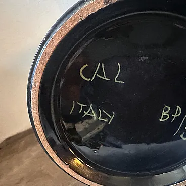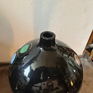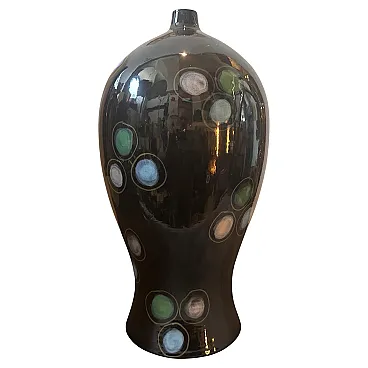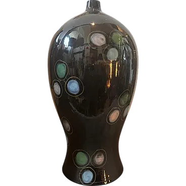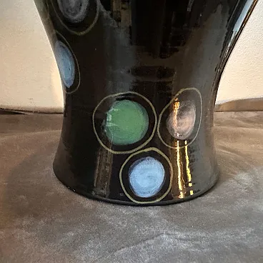 This is a 1960s Mid-Century Modern ceramic single flower vase, designed in the manner of Gio Ponti. The vase features an elongated, curvaceous silhouette with a narrow neck and a subtly flared base, giving it a sculptural and elegant form. The surface is finished with a high-gloss black glaze, creating a striking contrast with the hand-painted circular motifs in soft pastel hues of blue, green, and beige. These abstract, organic shapes are outlined in gold or a metallic hue, adding a refined decorative touch reminiscent of Ponti's playful yet sophisticated design sensibility. The vase embodies the Mid-Century Modern aesthetic, characterized by clean lines, simple yet bold decoration, and a focus on artistic craftsmanship. This piece would make a statement as a decorative object while also serving as a functional vessel for a single flower or small floral arrangement. The vase it's in perfect condition.