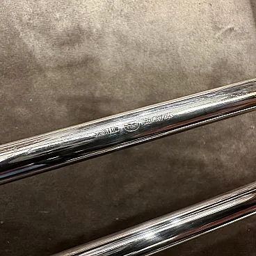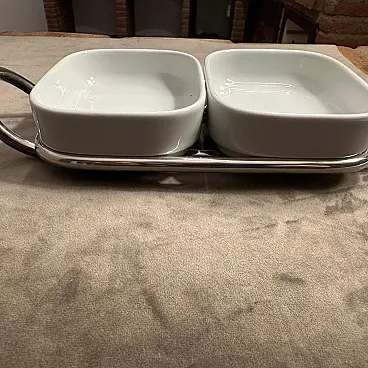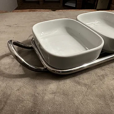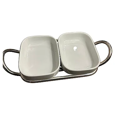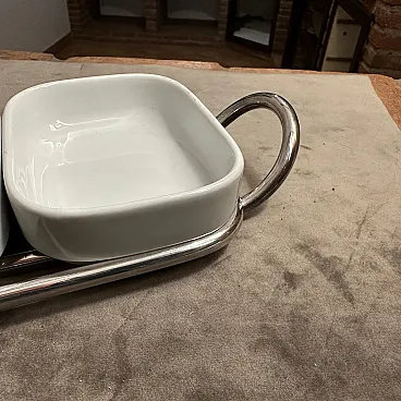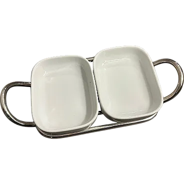 This 1980s minimalist appetizer tray is designed by Lino Sabattini and manufactured by Sabattini Argenteria. Lino Sabattini is an influential Italian designer known for his modernist approach to tableware and metalwork. Silver-plated metal frame with white ceramic dishes are in perfect condition, probably never used Design is Elegant and minimalist, with clean lines and functional simplicity. Two curved metal handles on either side for easy carrying. 1980s modernist design, with a focus on understated luxury and high-quality materials This serving piece reflects Sabattini's signature aesthetic, blending functionality with refined craftsmanship, making it ideal for entertaining or display in a contemporary or mid-century modern home. The tray is marked on the bottom Sabattini, it's an iconic piece of Sabattini Argenteria in Milano.
