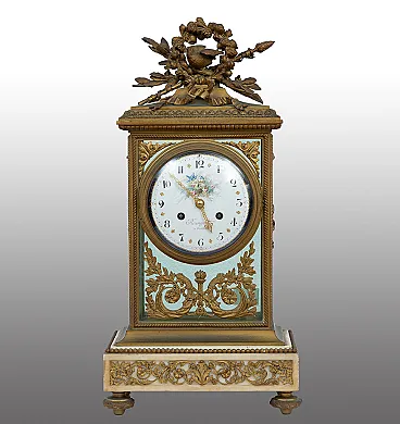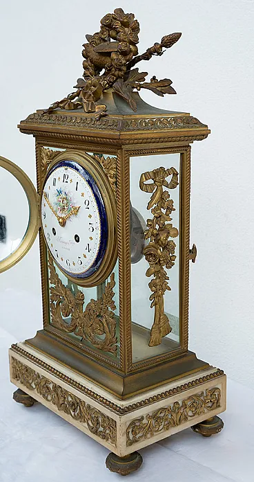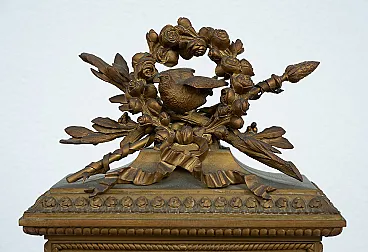 A refined all -round sculpture depicting a bird between roses, leaves and ribbons, a symbol of love and peace, is positioned above the case.