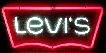 Levi's luminous neon sign for the brand's dealer store, made of plexiglass with white and red neon lettering and decorations. Size 51x28 cm, depth 12 cm, equipped with rope to be hung. Excellent condition, without injuries or missing parts, and, as shown in the photo, fully functional.