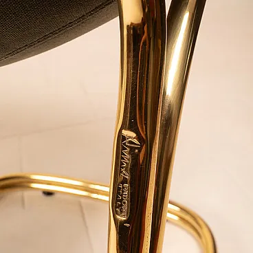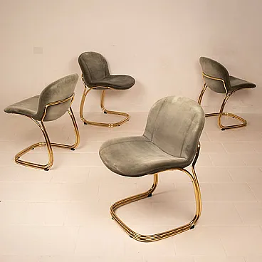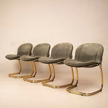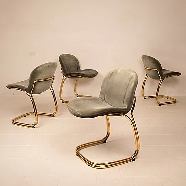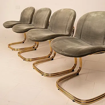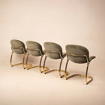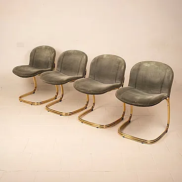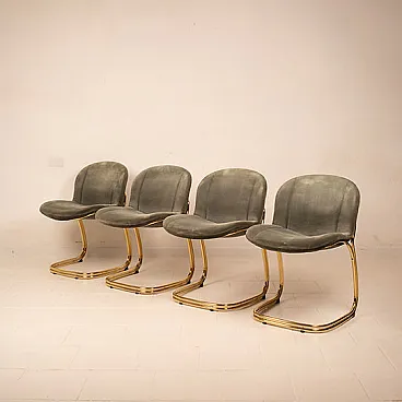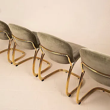 Extraordinary and rare set of Sabrina chairs in the most expensive and limited edition version produced at the end of the 70s by the Rima di Padova company and designed by Giorgio Rinaldi in collaboration with his brother Gastone. The set stands out from the many on the market as it is built with full and unconstored brass structure, branded incussion by the company. The stuffed seats are not removable but fixed and covered with a beautiful oil green velvet in excellent condition, with small signs of time given its more than 50 years, visible in photography.
