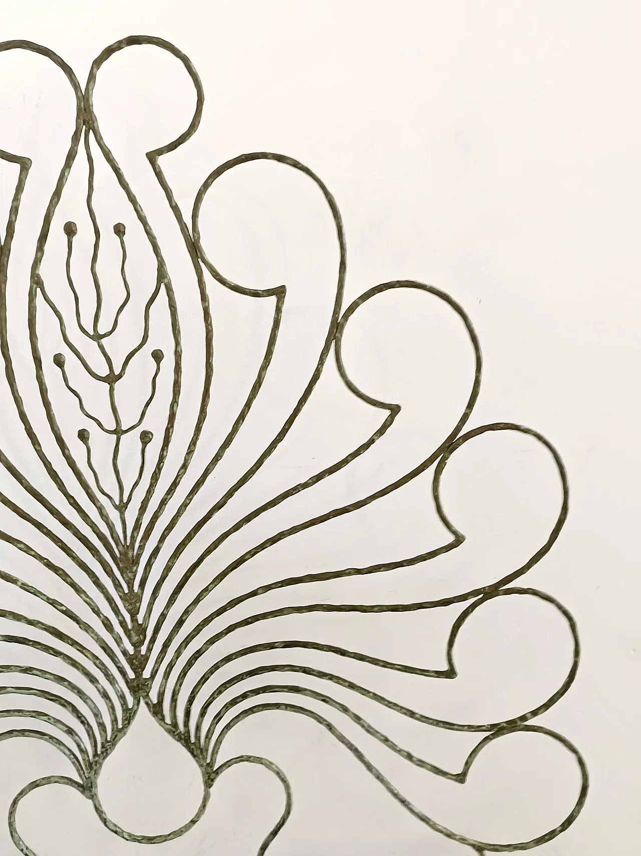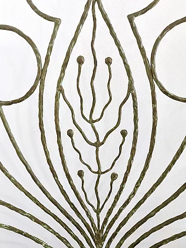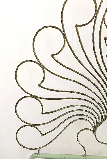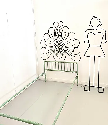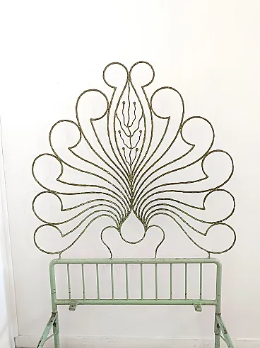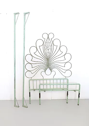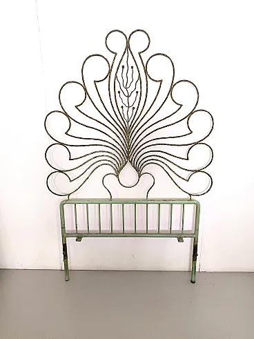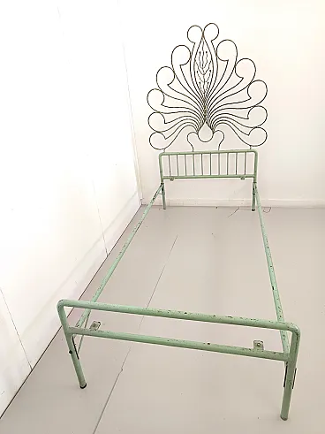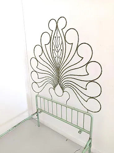 Made in Italy, 1950s. The very simple structure brings attention to the stunning headboard. This bed frame is hand-made in brass and mint green varnished iron. The frame is solid but it shows slight traces of use and its original patina. On request we can revarnish it. Slat is not included. Measures: Internal width: 192 cm Internal depth: 84 cm Headboard height: 157 cm. Headboard width: 104 cm Order it now! We sell the best quality pieces and we offer an amazing service: if it's not during night time, we answer within 2 hours and we absolutely love to follow every step of the purchase and even after. As matter of fact we really appreciate our customers’ feedback and when we receive pictures of our pieces in their new homes. We assist you during the process and answer all your questions. In addition to this, we always review the pieces before shipping, so that you receive the goods at its very best. We provide the best possible quotes and professionally and carefully pack the items. Insurance is included. And if there is any issue, it is our mission to make so you don't have to worry: we will always be there for you to assist in any way possible.