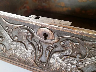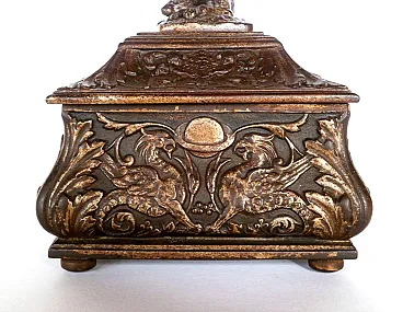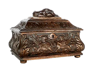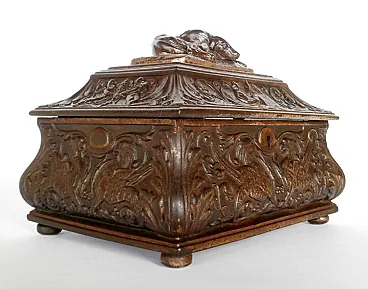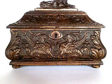 Antique box Ilsenburg, Germany 1878 Metal merger Grey dog and overhanging decorations with griffins and the planet Saturno "Ilsenburg 1878" imprinted in the metal Curious object and excellent workmanship