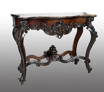 Description: Antique console Luigi Filippo Neapolitan in precious exotic wood with Levanto red marble top. The Levanto red marble top coeval at the console rests on a mixtilinear band with a beautiful finely carved top in the center. The four feet having a Cabriolet trend are connected by a mixtilinear cruise with a carving in the center and end with an improflex Conditions: good condition. Origin: Naples 19th century. Measures: 135x50 h105cm. Document: certificate of authenticity. Assistance: we are at your disposal for further clarifications or photographic details Shipping: throughout Italy Europe and the rest of the world at very low prices in maximum safety and traceable. The shipment will be agreed privately and will not be high cost. We wish you a good day. Borrelli Antiquity.