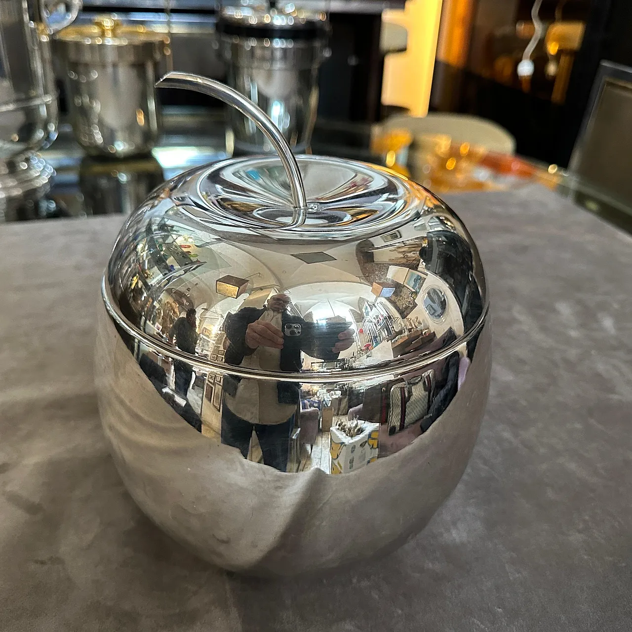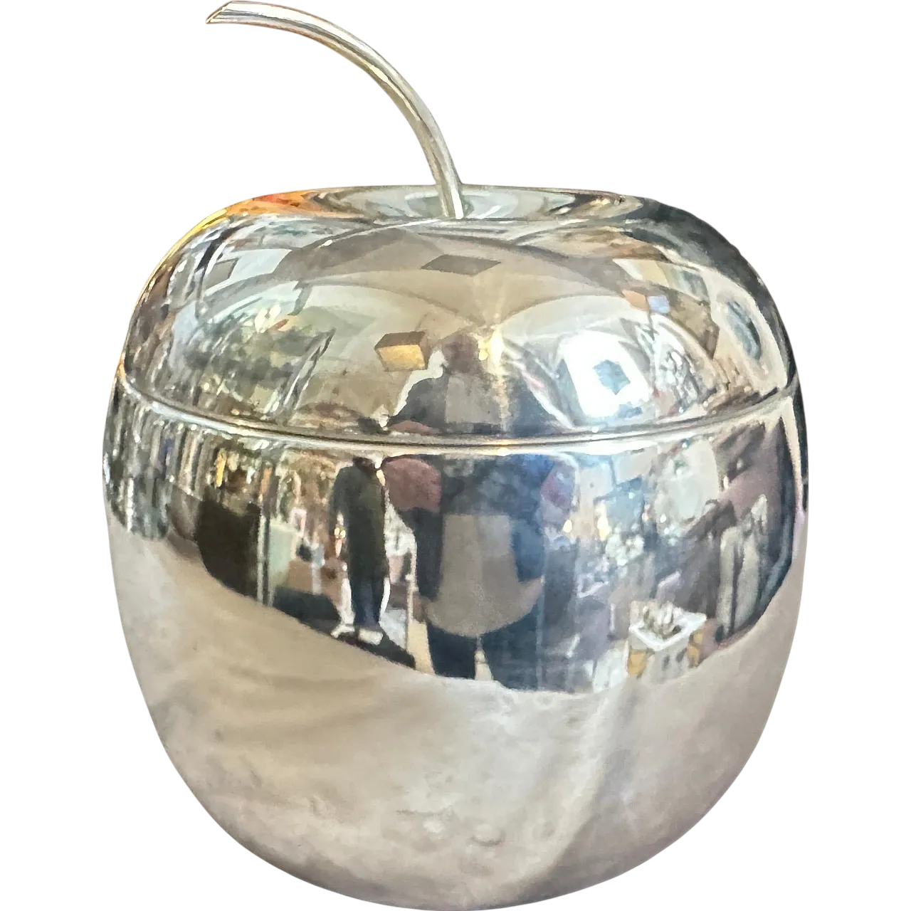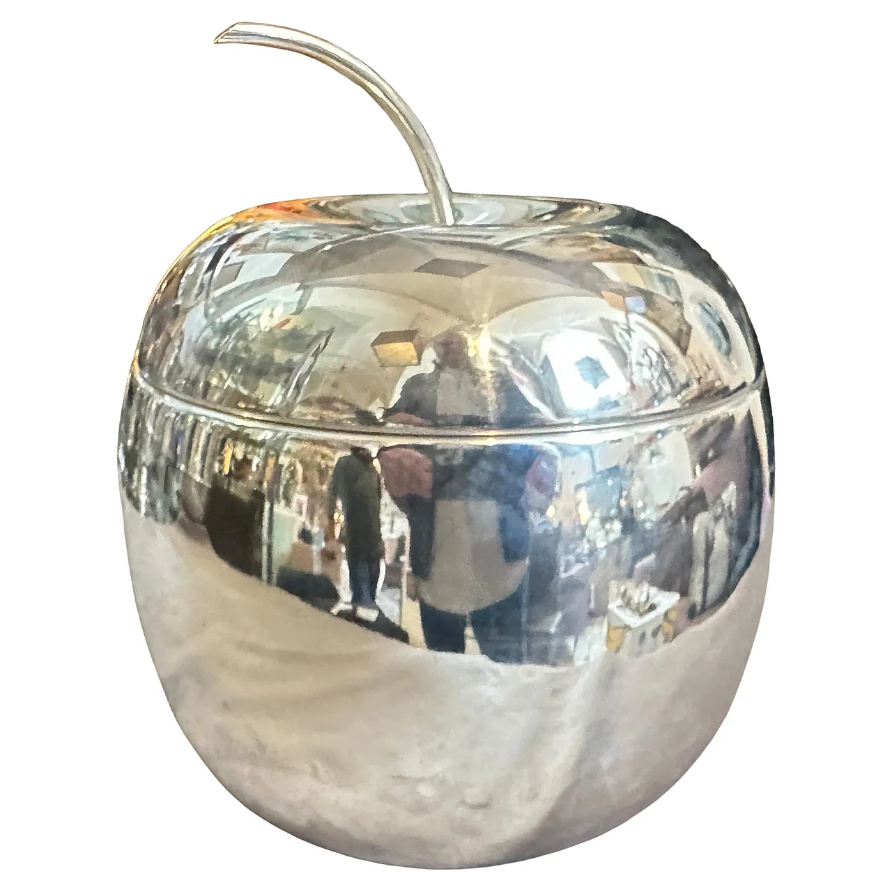 This 1980s Minimalist silver-plated ice bucket by Teghini Firenze is an elegant and functional piece of barware, designed with a sleek, modern aesthetic. The bucket is crafted in the shape of an apple, featuring a smooth, highly reflective surface that showcases its minimalist style. The lid is seamlessly integrated into the design, maintaining the clean lines and simplicity that characterize minimalist decor. A gracefully curved stem-like handle at the top adds a subtle decorative touch while serving as a functional grip for opening the lid. Teghini Firenze, an Italian maker known for quality craftsmanship, has designed this piece with both beauty and practicality in mind. The silver-plated finish enhances its luxurious appeal, making it a striking addition to any bar or dining setting. The reflective surface captures and distorts its surroundings, creating an eye-catching visual effect. This ice bucket is a perfect blend of form and function, embodying the sophisticated yet understated elegance of 1980s minimalist design. It's in lovely vintage condition.