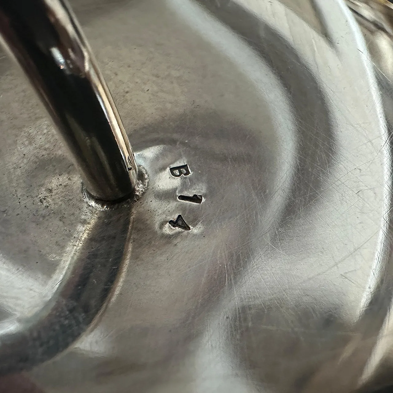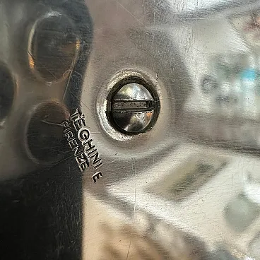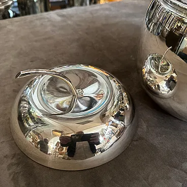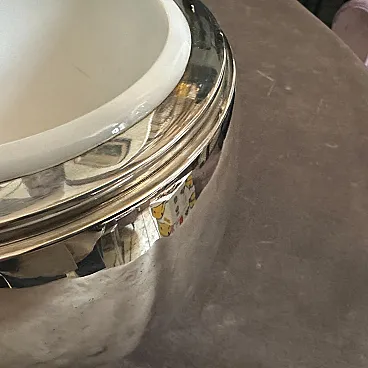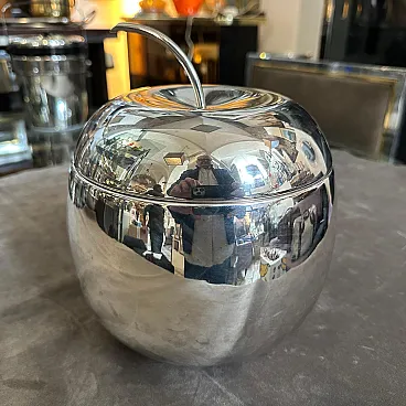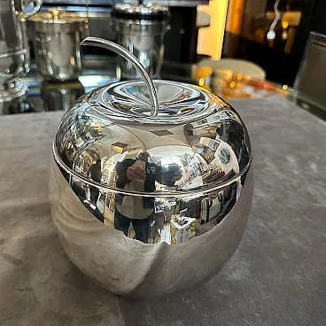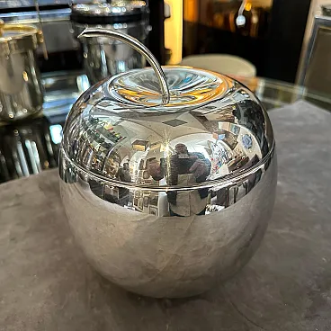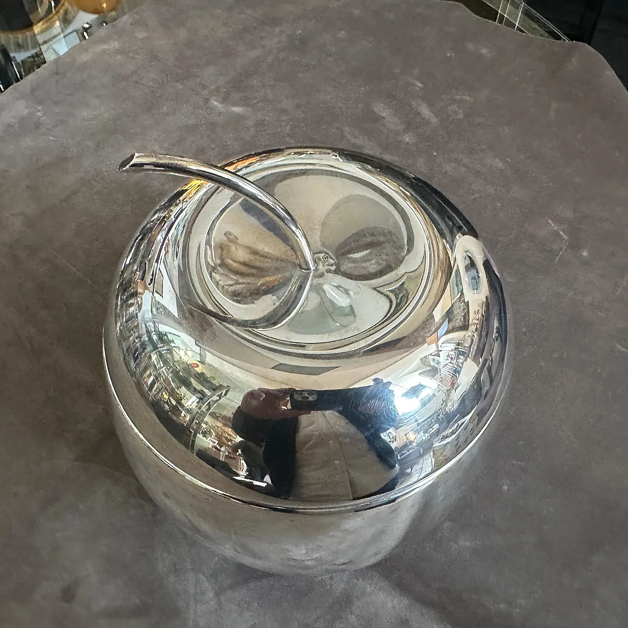 This 1980s Minimalist silver-plated ice bucket by Teghini Firenze is an elegant and functional piece of barware, designed with a sleek, modern aesthetic. The bucket is crafted in the shape of an apple, featuring a smooth, highly reflective surface that showcases its minimalist style. The lid is seamlessly integrated into the design, maintaining the clean lines and simplicity that characterize minimalist decor. A gracefully curved stem-like handle at the top adds a subtle decorative touch while serving as a functional grip for opening the lid. Teghini Firenze, an Italian maker known for quality craftsmanship, has designed this piece with both beauty and practicality in mind. The silver-plated finish enhances its luxurious appeal, making it a striking addition to any bar or dining setting. The reflective surface captures and distorts its surroundings, creating an eye-catching visual effect. This ice bucket is a perfect blend of form and function, embodying the sophisticated yet understated elegance of 1980s minimalist design. It's in lovely vintage condition.