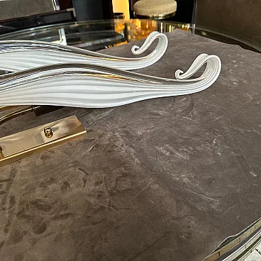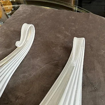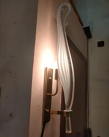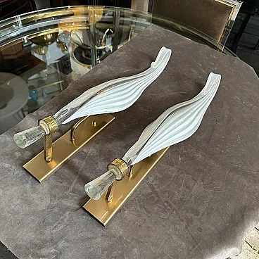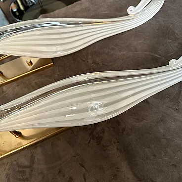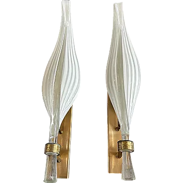 This pair of 1970s Mid-Century Modern Murano glass wall sconces by Franco Luce showcases the elegance and artistry of Italian glassmaking. Each sconce features an elongated, sculptural Murano glass shade with a gracefully tapered form, creating a striking visual impact. The glass is crafted with a ribbed texture and a subtle white swirl pattern, enhancing its depth and sophistication. The sconces are mounted on sleek brass and gilded metal backplates, which provide a warm contrast to the cool translucency of the glass. A decorative brass ring secures the glass at the base, adding a refined touch while emphasizing the overall luxurious design. These statement pieces embody the timeless appeal of Mid-Century Italian lighting, blending craftsmanship with modern aesthetics. They would make an exquisite addition to any sophisticated interior, casting a soft, ambient glow while serving as striking decorative elements, they are in working order and in very good condition overall.