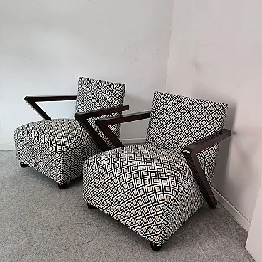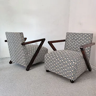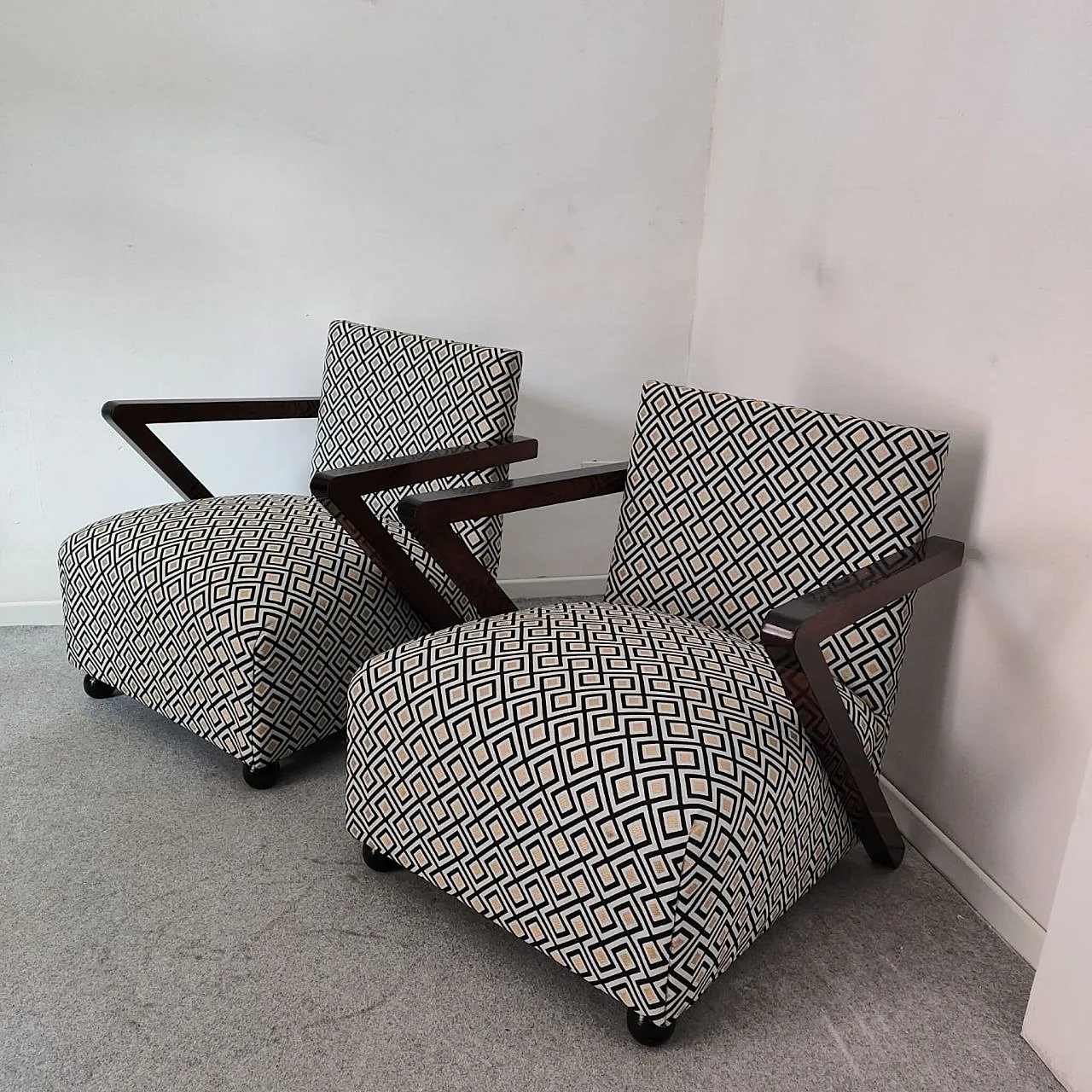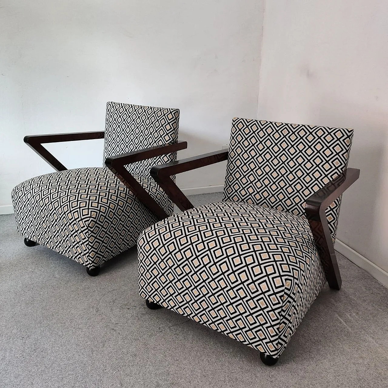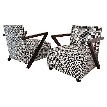 Pair of Italian art déco armchairs in walnut and geometric fabric, 1930s